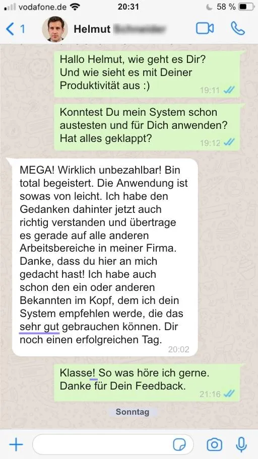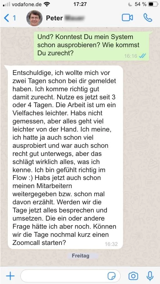 Aber das was du mir vor kurzem gezeigt hast, ist ja fast nicht zu glauben, daher war ich entsprechend skeptisch. Vor allem, ob ich damit in meinem Business eine 3- bis 10-fache Produktivitätssteigerung erzielen würde. Doch die Praxis hat mich mehr als überzeugt, das ist wirklich bahnbrechend.