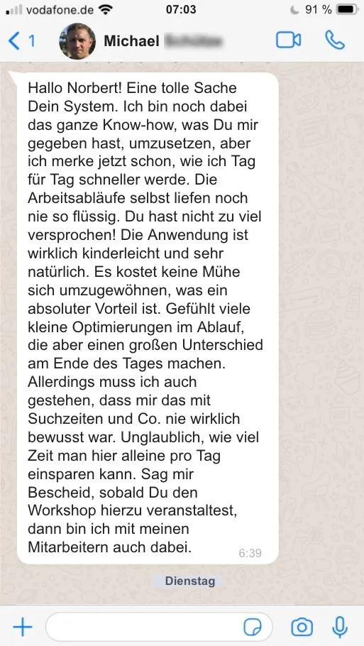 Ich kann nur sagen, dass diese System mir bewusst vor Augen geführt habe, wo ich bisher jeden Tag viel Zeit verschwendet habe und ich jetzt meine tägliche Arbeit viel effektiver und effizienter erledige als bisher.